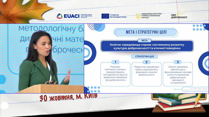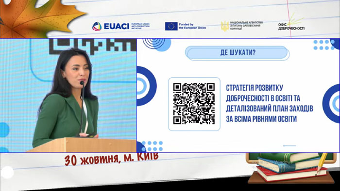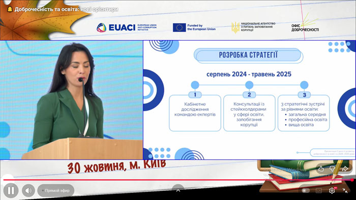 Особливу увагу було приділено «Стратегії розвитку доброчесності в освіті на 2026–2030 роки», що розроблялася у партнерстві з Міністерством освіти і науки України, Антикорупційною ініціативою ЄС, представниками академічної спільноти, громадських організацій, педагогами й студентами. Стратегія узагальнює напрацювання експертного та освітянського середовища та закладає вектори на майбутнє для всіх рівні освіти: загальної середньої, професійної та вищої освіти.