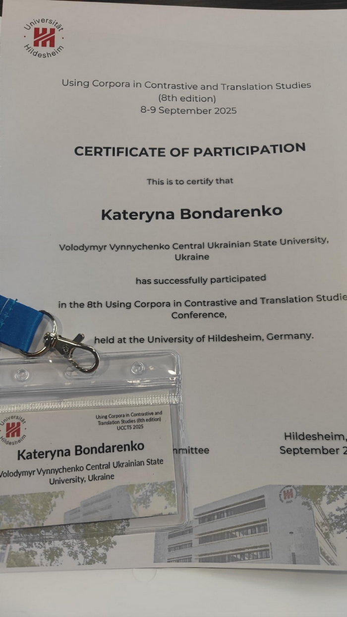 8–10 вересня 2025 року доцентка кафедри перекладу, прикладної та загальної лінгвістики факультету української філології, іноземних мов та соціальних комунікацій Катерина Бондаренко взяла участь у міжнародній конференції Using Corpora in Contrastive and Translation Studies (UCCTS 2025). Захід відбувся в Інституті перекладознавства і спеціальних комунікацій Університету Гільдесгайма (Німеччина).
