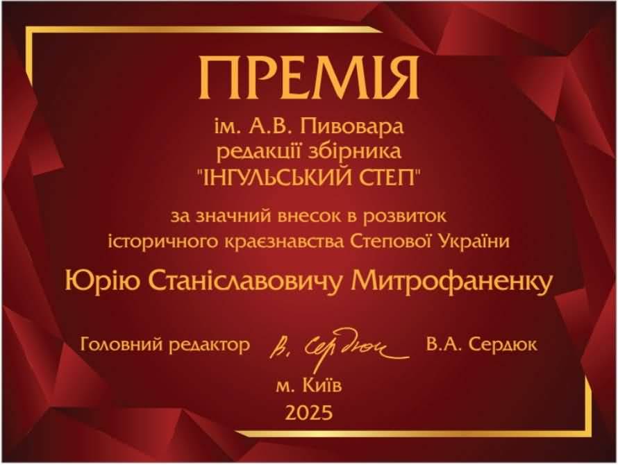 Історик Юрій Митрофаненко отримав Премію імені А.В. Пивовара за вагомий внесок у розвиток краєзнавства Степової України