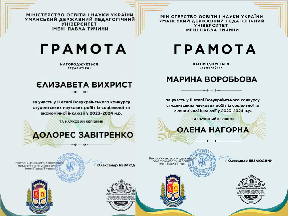 16 травня 2024 року студентки спеціальності 016. Спеціальна освіта Ліза Вихрист, студентка 3 курсу (керівник к.п.н., доцент Д. Завітренко)та Воробйова Марина, студентка 4 курсу факультету педагогіки, психології та мистецтв (керівник к.п.н., ст. викладач Нагорна О. В.) взяли участь у ІІ етапі Всеукраїнського конкурсу студентських робіт із соціальної та економічної інклюзії.