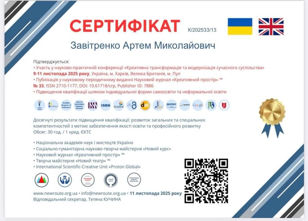 Участь студентів-науковців у конференції «Креативна трансформація та модернізація сучасного суспільства» 9-11 листопада 2025 року Україна, Велика Британія, м.Пул.