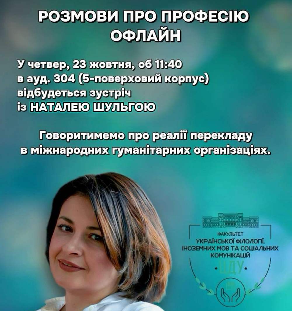 Цього разу старшокурсникам випала нагода поговорити з Наталею Шульгою, випускницею нашого університету, освітянкою і перекладачкою, хоча сама пані Наталя свою роботу воліє називати language assistance. Вона забезпечує міжмовну комунікацію на стику письмового перекладу, усного перекладу-супроводу (community interpreting) і фактичного фіксерства, тобто координації іноземців на місці, що включає проактивне спілкування, вирішення питань логістики й побуту, убезпечення комунікації з представниками місцевих громад тощо. До агресії РФ пані Наталя активно співпрацювала з регулярними місіями Бюро ОБСЄ з демократичних інститутів та прав людини (osce/odihr), які спостерігали за проведенням виборів в Україні, в від найперших днів збройної агресії і по сьогоднішній день — з представництвами великих міжнародних гуманітарних організацій, які опікуються питаннями медичної допомоги постраждалим від російської агресії, підтримки переміщених осіб і надають іншу доброчинну допомогу нашій країні.