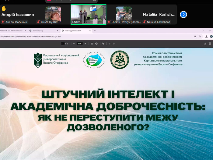4 листопада 2025 року доценти кафедри технологічної та професійної освітиОксана Абрамова, Ольга Пуляк та Сергій Рябець разом зі студентами спеціальності «Технології», груп ТН22б та ТО25М, долучилися до міжуніверситетського тренінгу «Штучний інтелект і академічна доброчесність: як не переступити межу дозволеного», організованого Карпатським національним університетом імені Василя Стефаника.