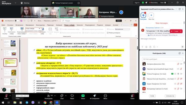 30 жовтня 2025 року студенти ІІІ курсу, групи БХ23Б, ОП Середня освіта (Біологія та здоров’я людини. Хімія) разом з професором Дефорж Г.В. були учасниками вебінару «Здоровий спосіб життя в умовах війни: соціально-психологічний підхід», який відбувся в рамках 17-тої освітньої виставки «Інноватика в сучасній освіті».