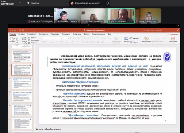 Лазоренко Борис Петрович, кандидат філософських наук, доцент, провідний науковий співробітник відділу соціальної психології особистості Інституту соціальної та політичної психології НАПН України, доповідь «Здоровий спосіб життя та психологічний добробут комбатантів і волонтерів: стратегії відновлення і забезпечення в умовах війни».