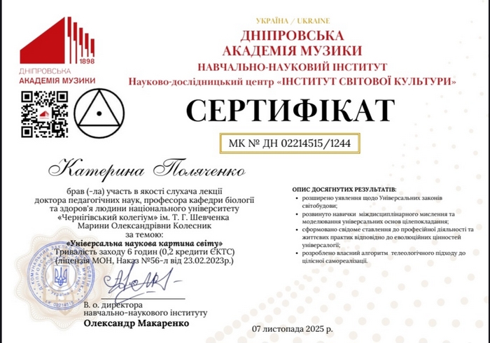 Викладачі та студенти спеціальності 017 Фізична культура і спорт взяли участь у заході в межах чинного договору про співпрацю з Громадською організацією “Міжнародна наукова школа універсології в Кіровоградській області”. Участь стала важливою частиною партнерської взаємодії, спрямованої на розширення можливостей професійного розвитку, неформальної освіти та зміцнення освітньо-наукової співпраці.