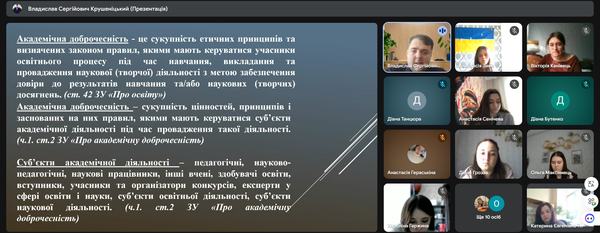 6 березня, з метою популяризації відповідальної академічної культури, що сприяє розвитку чесності, самостійності та довіри в освітньому й науковому середовищі, відбулася зустріч здобувачів ОП «Середня освіта (Історія та громадянська освіта)», ОП «Середня освіта (Історія, Правознавство)» із провідним фахівцем навчально-наукового відділу В.Крушеніцьким.