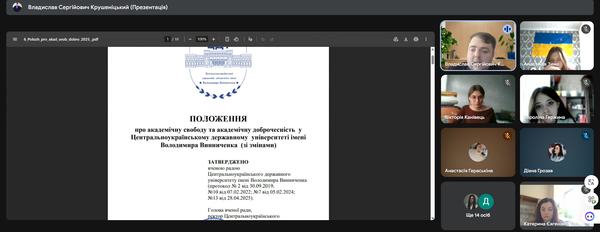 Владислав Сергійович ознайомив із основними положеннями Закону України «Про академічну доброчесність», з нормативними актами університету, що регулюють питання академічної доброчесності в університеті (Етичний кодекс університетської спільноти в Центральноукраїнському державному університеті імені Володимира Винниченка, Положення про академічну свободу та академічну доброчесність у Центральноукраїнському державному університеті імені Володимира Винниченка). Також детально було розкрито питання порушень академічної доброчесності та відповідальності за них.