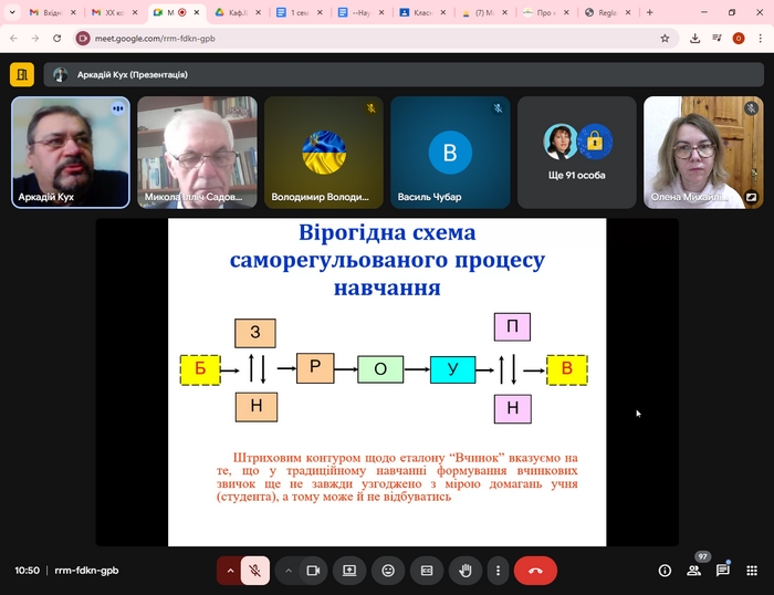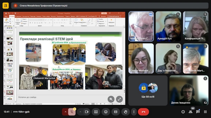 Новітніми науково-педагогічними ідеями в галузі технологічної освіти учнів ЗЗСО як підґрунтя професійної підготовки студентів ЗПО поділилися доктор педагогічних наук Володимир СТЕШЕНКО професор кафедри теорії і практики технологічної та професійної освіти «Донбаський державний педагогічний університет»; Аркадій КУХ доктор педагогічних наук, професор кафедри методики викладання фізики і дисциплін технологічної освітньої галузі Кам’янець-Подільського національного університету імені Івана Огієнка поділився результатами ґрунтовного дослідження щодо еталонних вимірників якості знань і формувальне оцінювання; директор Навчально-наукового інституту перепідготовки та підвищення кваліфікації Українського державного університету імені Михайла Драгоманова, доктор педагогічних наук, професор Володимир СЕРГІЄНКО підняв питання про підвищення якості перепідготовки та підвищення кваліфікації як основи самоосвітньої діяльності фахівців; Олександр МАРТИНЮК доктор педагогічних наук, професор кафедри експериментальної фізики, інформаційних та освітніх технологій Волинського національного університету імені Лесі Українки запропонував до впровадження розроблені ним інструменти Bring Your Own Device (BYOD) в системі реалізації напрямку STEM; доктор педагогічних наук, професор кафедри інформаційних технологій та фізико-математичних дисциплін Херсонського навчально-наукового інституту Національного університету кораблебудування імені адмірала Макарова Марина ЛІТВІНОВА поділилася актуальною інформацією в частині організації й результатів освітнього процесу в закладах освіти на окупованих територіях; спільна доповідь кандидата педагогічних наук, директора навчально-наукового інституту інформаційних та освітніх технологій Анни ТКАЧЕНКО, доктора педагогічних наук, професора, директора центру цифрового розвитку та якості освіти Валерія ГРИЦЕНКА, доктора педагогічних наук, професора кафедри автоматизації комп'ютерно-інтегрованих технологій Галини ЛУЦЕНКО з Черкаського національного університету імені Богдана Хмельницького присвячена розвитку цифрової компетентності викладача як чинник ефективної цифровізації освітнього процесу в ЗВО, де значна увага приділена АСУ; проблему впровадження STEM технологій в освітній процес різного рівня розкрила Олена ТРИФОНОВА доктор педагогічних наук, професор, в.о.завідувача кафедри інформаційних та цифрових технологій Центральноукраїнського державного університету імені Володимира Винниченка; безпековим умовам у наукових дослідженнях на прикладі аварії на четвертому блоці Чорнобильської атомної електростанції приділив увагу в своєму виступі доктор педагогічних наук, професор кафедри інформаційних та цифрових технологій Центральноукраїнського державного університету імені Володимира Винниченка Микола САДОВИЙ.