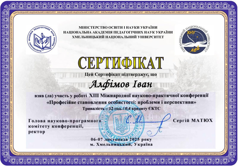 6–7 листопада 2025 року викладачі кафедри технологічної та професійної освіти і студенти спеціальності «Середня освіта (Технології)» нашого університету долучилися до ХІІІ Міжнародної науково-практичної конференції «Професійне становлення особистості: проблеми і перспективи», що відбулася на базі Хмельницького національного університету.