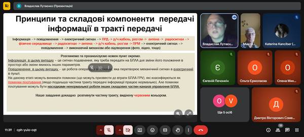 Під час лекції студенти факультету ознайомилися з основними поняттями радіоелектронної боротьби, принципами роботи безпілотних літальних апаратів і фізичними процесами, що лежать в основі сучасних засобів зв’язку та протидії. Владислав Лутаєнко підготував цикл змістовних презентацій, що охоплювали такі теми: