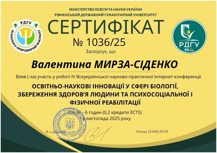 Здобувачі вищої освіти ОР «Бакалавр» спеціальності “Біологія та здоров’я людини” Центральноукраїнського державного університету ім. Володимира Винниченка, студентки БХ23Б, Юлія Авраменко, Анастасія Паламарчук та їх науковий керівник, к.б.н., доцент кафедри природничих наук та методики викладання Мирза-Сіденко Валентина Миколаївна, взяли участь у IV Всеукраїнській науково-практичній інтернет-конференції «Освітньо-наукові інновації у сфері біології, збереження здоров’я людини та психосоціальної й фізичної реабілітації», проведеній кафедрою біології, здоров’я людини та фізичної терапії Рівненського державного гуманітарного університету 14 листопада 2025 року.