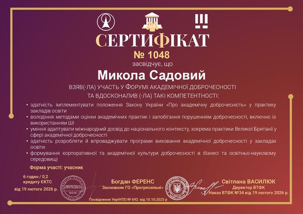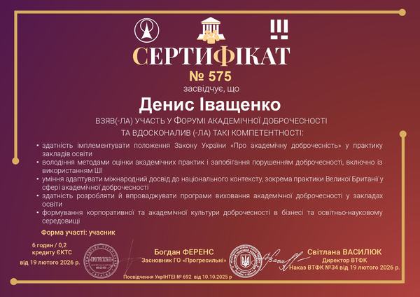 Форум став професійним майданчиком для обговорення практичних аспектів реалізації Закону України «Про академічну доброчесність» та трансформації освітнього ландшафту в умовах цифровізації й активного використання технологій штучного інтелекту. Особливу увагу було приділено питанням формування культури доброчесності, запобігання академічним порушенням, а також пошуку ефективних інструментів їх попередження в освітньо-науковому середовищі.