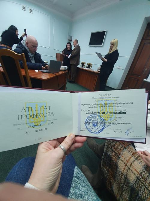 Зокрема, атестат професора було вручено кандидату економічних наук, доценту кафедри менеджменту та підприємництва Бондар Юлії Анатоліївні. Отримання атестата є визнанням високого рівня наукової та педагогічної діяльності, професійної компетентності й вагомого внеску у розвиток вищої освіти.
