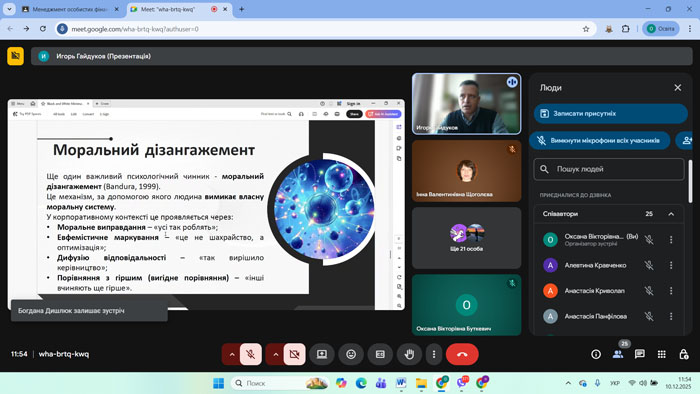 10 грудня 2025 року на кафедрі менеджменту та підприємництва ЦДУ ім. В. Винниченка відбулася гостьова лекція. У межах вивчення дисциплін «Бухгалтерський облік та аудит», «Фінансовий менеджмент» і «Логістика» студенти занурилися у тему «Психологічні детермінанти схильності до корпоративного шахрайства».