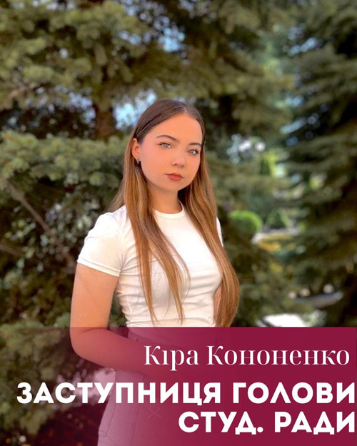 Кононенко Кіра (спеціальність: Право, група ПР24Б) - надійна заступниця голови, завжди підтримує роботу ради та допомагає в реалізації важливих рішень.