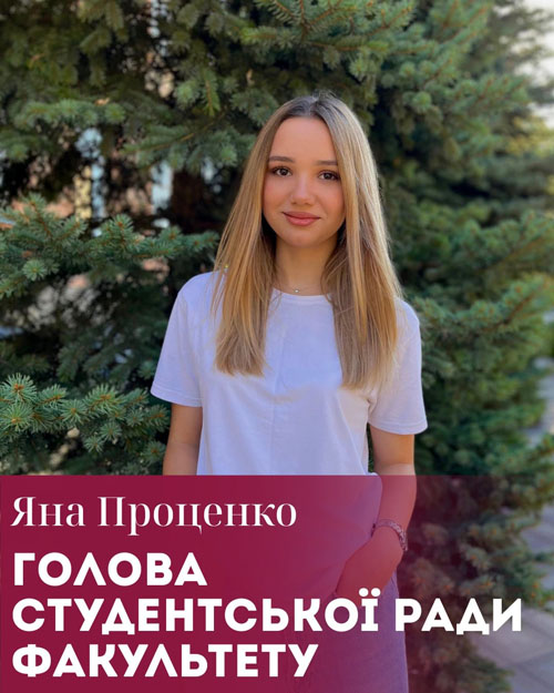 Проценко Яна (спеціальність: Право, група ПР24Б) - відповідальна та ініціативна голова студентської ради ФПБА, яка вміє об’єднувати команду й відстоювати інтереси студентів.
