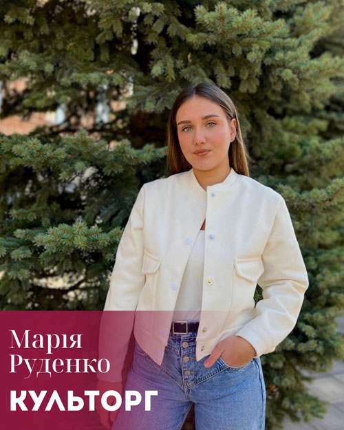 Руденко Марія (спеціальність: Право, група ПР24Б) - креативна культорг ФПБА, яка наповнює студентське життя яскравими подіями та атмосферою єдності.
