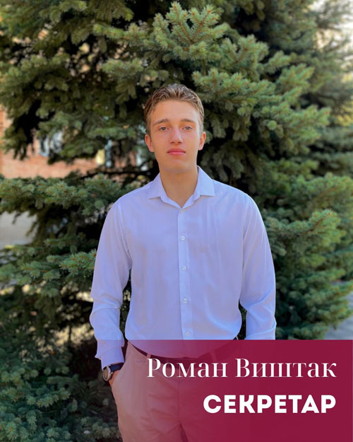 Виштак Роман (спеціальність: Право, група ПР24Б) - організований секретар ФПБА, який забезпечує чіткість, порядок і своєчасність у роботі ради.