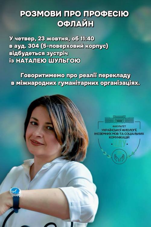 Цього разу старшокурсникам випала нагода поговорити з Наталею Шульгою, випускницею нашого університету, освітянкою і перекладачкою, хоча сама пані Наталя свою роботу воліє називати language assistance. Вона забезпечує міжмовну комунікацію на стику письмового перекладу, усного перекладу-супроводу (community interpreting) і фактичного фіксерства, тобто координації іноземців на місці, що включає проактивне спілкування, вирішення питань логістики й побуту, убезпечення комунікації з представниками місцевих громад тощо. До агресії РФ пані Наталя активно співпрацювала з регулярними місіями Бюро ОБСЄ з демократичних інститутів та прав людини (osce/odihr), які спостерігали за проведенням виборів в Україні, в від найперших днів збройної агресії і по сьогоднішній день — з представництвами великих міжнародних гуманітарних організацій, які опікуються питаннями медичної допомоги постраждалим від російської агресії, підтримки переміщених осіб і надають іншу доброчинну допомогу нашій країні.