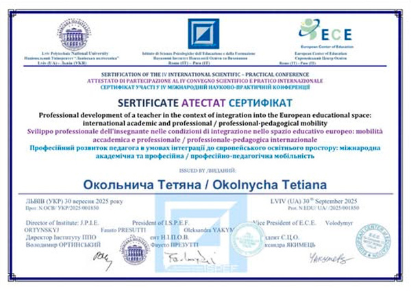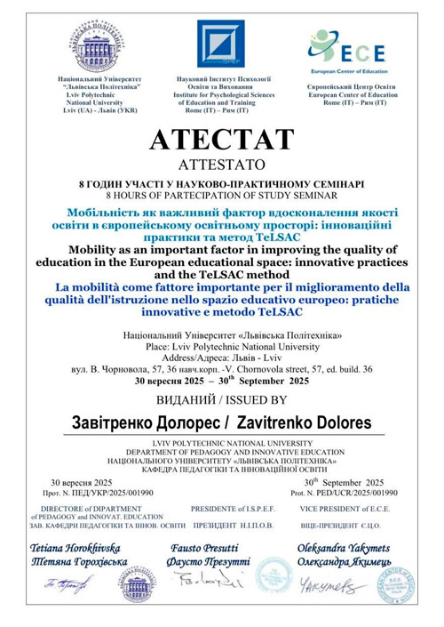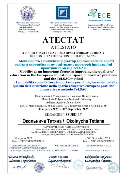 Члени кафедри спеціальної освіти, факультету освітніх наук Центральноукраїнського державного університету імені Володимира Винниченка професор Тетяна Окольнича та доцент Долорес Завітренко взяли участь у науково-практичному семінарі «Мобільність як важливий фактор вдосконалення якості освіти в європейському освітньому просторі: інноваційні практики та метод TeLSAC».