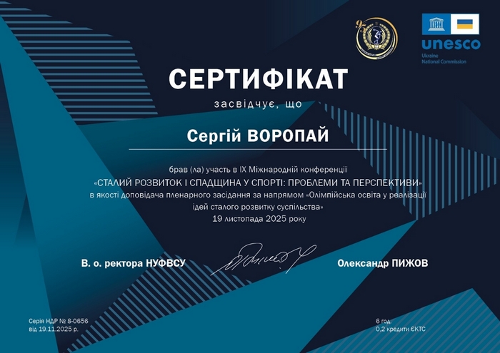 19–20 листопада професор кафедри теорії та методики спорту Воропай Сергій Миколайович взяв участь у роботі ІХ Міжнародної науково-практичної конференції “Сталий розвиток і спадщина у спорті: проблеми та перспективи”, що відбулася в Національному університеті фізичного виховання і спорту України (НУФВСУ), м. Київ. https://surl.li/qjhamc