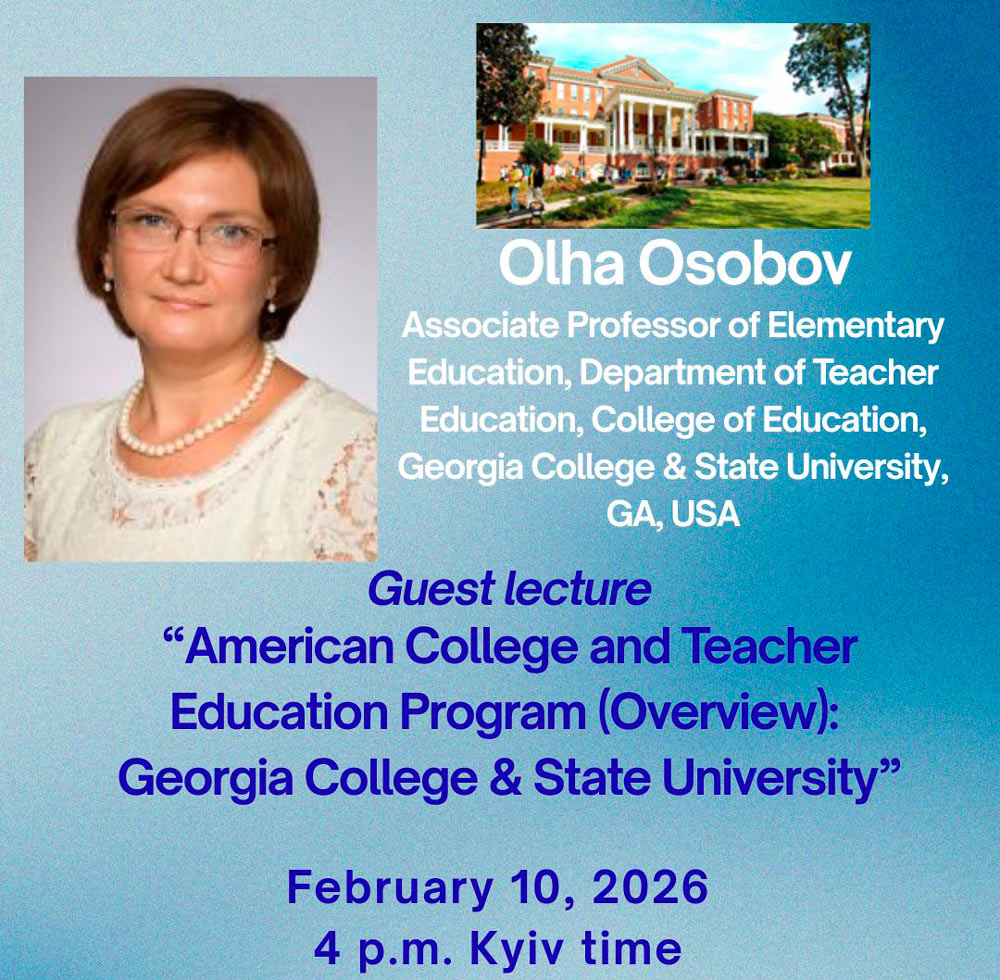 10 лютого 2026 року здобувачі освітньої програми «Середня освіта. Англійська й німецька мови та зарубіжна література» долучилися до гостьової лекції доцентки педагогічного коледжу Державного університету штату Джорджія (США) Ольги Особової на тему: “American College and Teacher Education Program (Overview): Georgia College & State University /Освітня програма підготовки вчителів у Педагогічному коледжі університету Georgia College & State University”.