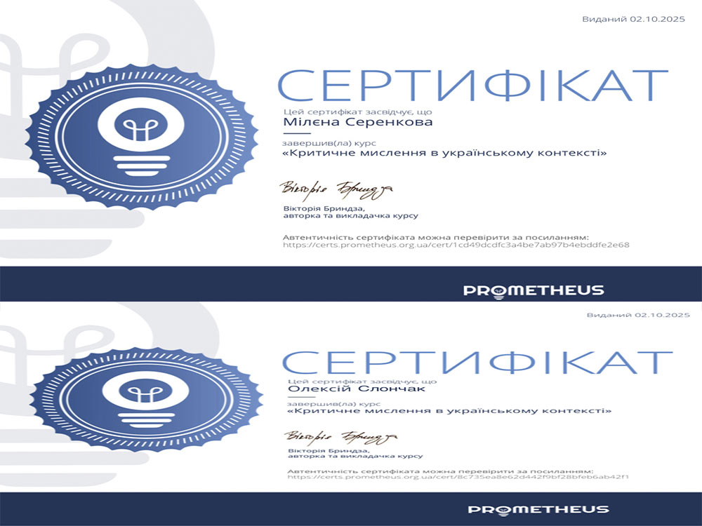 Здобуття неформальної та інформальної освіти є важливим етапом у професійному й особистісному розвитку сучасного фахівця. Здобувачі вищої освіти спеціальності менеджмент (гр. МЛ-23Б) Серенкова Мілєна та Слончак Олексій кафедри менеджменту та підприємництва Центральноукраїнського державного університету імені Володимира Винниченка підтвердили це на практиці, успішно пройшовши онлайн-курс «Критичне мислення в українському контексті» в межах дисципліни «Поведінкова економіка» на освітній платформі Prometheus.
