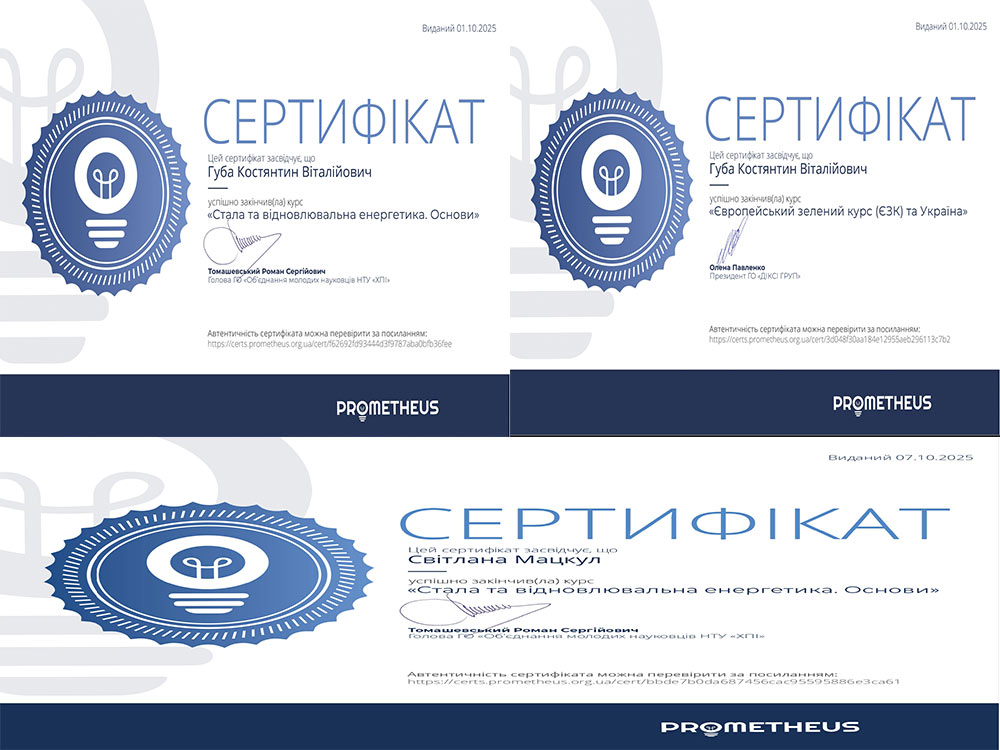 Здобувачі першого (бакалаврського) рівня вищої освіти кафедри менеджменту та підприємництва Центральноукраїнського державного університету імені Володимира Винниченка з навчальних груп ЕК24Б – Губа Костянтин (спеціальність Економіка) та МЛ24Б2 – Мацкул Світлана (спеціальність Менеджмент) успішно пройшли онлайн-курси «Європейський зелений курс (ЄЗК) та Україна» таі «Стала та відновлювальна енергетика. Основи» на освітній платформі Prometheus.