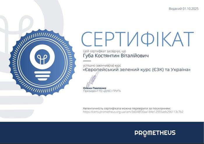Здобувачі першого (бакалаврського) рівня вищої освіти кафедри менеджменту та підприємництва Центральноукраїнського державного університету імені Володимира Винниченка з навчальних груп ЕК24Б – Губа Костянтин (спеціальність Економіка) та МЛ24Б2 – Мацкул Світлана (спеціальність Менеджмент) успішно пройшли онлайн-курси «Європейський зелений курс (ЄЗК) та Україна» таі «Стала та відновлювальна енергетика. Основи» на освітній платформі Prometheus.