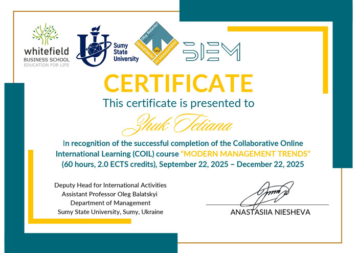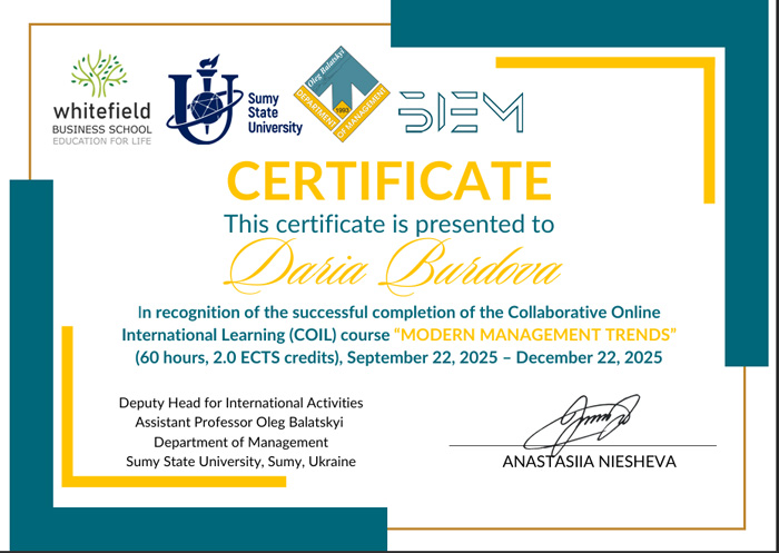 Висловлюємо щиру подяку координаторам спільного міжнародного COIL-курсу «Сучасні тенденції в менеджменті» за високий рівень організації, професійну підтримку та створення ефективного міжнародного освітнього середовища.