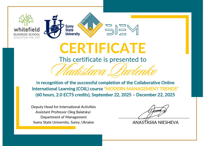 Здобувачі вищої освіти кафедри менеджменту та підприємництва Центральноукраїнського державного університету імені Володимира Винниченка спеціальності «Менеджмент» - Волкова Катерина, Маніта Ангеліна, Дар'я Бурдова а також спеціальності «Економіка» - Пожарська Євгенія, Тюріна Єлизавета, Жук Тетяна, Павленко Владислава, Кривенко Назар, Олійник Ігор успішно долучилися до спільного онлайн-курсу міжнародного навчання (COIL) «Сучасні тенденції в менеджменті».