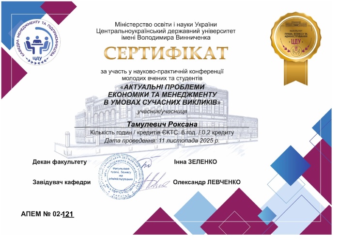 Члени наукового гуртка «Creative communication», здобувачі першого (бакалаврського) рівня вищої освіти кафедри менеджменту та підприємництва, взяли активну участь у науково-практичній конференції молодих вчених та студентів «Актуальні проблеми економіки та менеджменту в умовах сучасних викликів», яка відбулася 11 листопада 2025 року.
