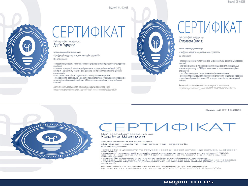 Здобувачі вищої освіти спеціальності «Менеджмент» - Бурдова Дар’я (гр. МЛ-23Б), Шапран Каріна (гр. МЛ-24Б2), а також студентка спеціальності «Комп’ютерні науки» - Снопік Єлизавета (гр. КН-23Б) кафедри менеджменту та підприємництва Центральноукраїнського державного університету імені Володимира Винниченка успішно пройшли онлайн-курс «Digital Media and Marketing Strategies» на платформі Prometheus у межах вибіркової дисципліни «Репутаційний менеджмент».