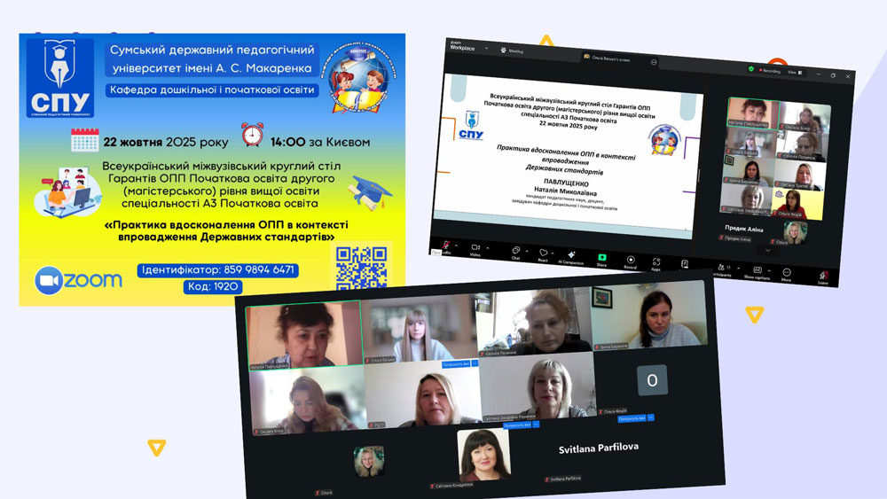 22 жовтня гаранти освітніх програм спеціальності «Початкова освіта» професор Радул О. С. (гарант ОПП другого (магістерського) рівня вищої освіти) та Баранюк І. Г. (гарант ОПП першого (бакалаврського) рівня вищої освіти) долучилися до Всеукраїнського міжвузівського круглого столу Гарантів ОПП Початкова освіта другого (магістерського) рівня вищої освіти спеціальності А3 Початкова освіта «Практика вдосконалення ОПП в контексті впровадження Державних стандартів», організований Сумським державним педагогічним університетом імені А. С. Макаренка.