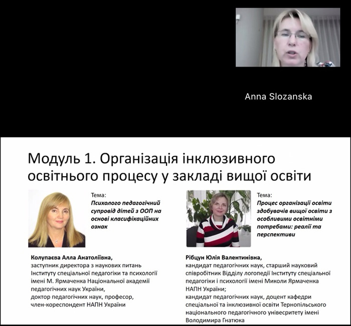 9 грудня 2025 р. викладачі кафедри спеціальної освіти Нагорна О., Окольнича Т. були присутніми на вебінарі на тему: «Психолого педагогічний супровід дітей з ООП на основі класифікаційних ознак». Тему представила професор Інституту спеціальної педагогіки та психології імені М. Ярмаченка НАПН України Колупаєва А.А.