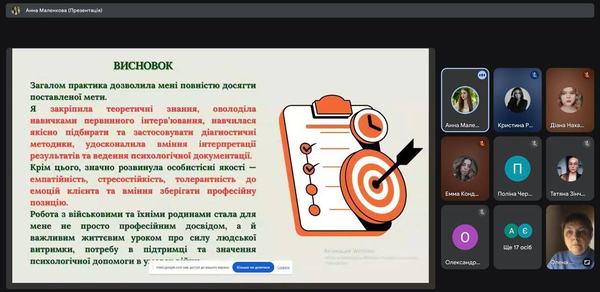 Проходження практики дало змогу студентам набути досвіду творчого й відповідального підходу до розв’язання реальних професійних завдань, пов’язаних із діяльністю практичного психолога, розвинути навички професійного спілкування, рефлексії та самоаналізу.