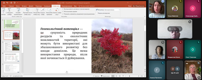 21 жовтня 2025 року в межах заходів екотижня відбулася відкрита лекція на тему «Геоекологічний потенціал Кіровоградської області для сталого розвитку рекреаційно-оздоровчої та спортивної діяльності», яку провела кандидат географічних наук, доцент кафедри філософії та соціальних науккафедри філософії та соціальних наукАнтоніна Володимирівна Зарубіна.