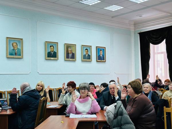 В обговоренні звіту голови профкому О. О. Горської про роботу профспілкового комітету університету за 2025 р. узяли участь ректор університету професор Є. Ю. Соболь, головний бухгалтер Ю. Ю. Суслова, голова Ради ветеранів університету професор А. Б. Рацул, запрошений голова обкому Профспілки С. Ю. Петров.
