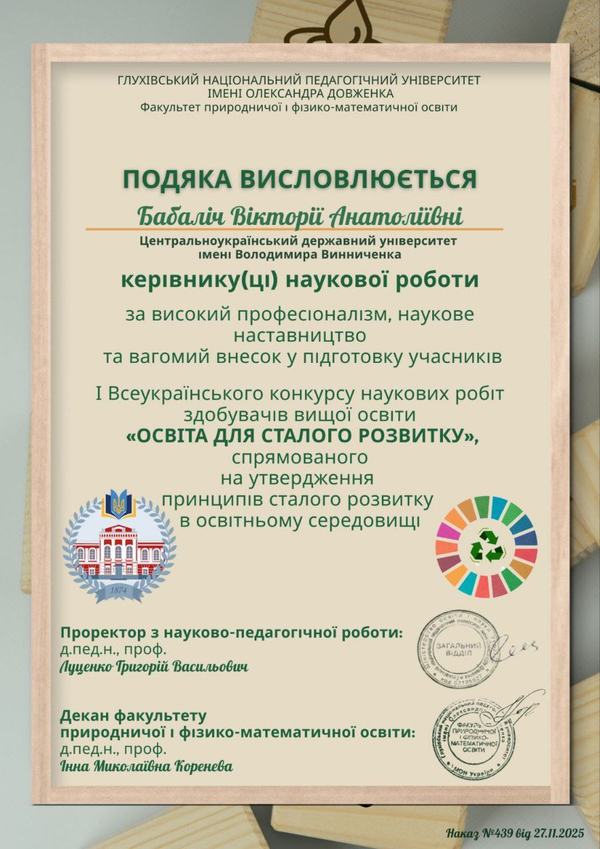 Окрема подяка висловлюється Бабаліч Вікторії Анатоліївні, керівниці наукової роботи, за професійний супровід, наукове наставництво та значний внесок у підготовку переможниці. Саме якісне наукове керівництво та системна робота зі студентами забезпечують високі результати й сприяють розвитку дослідницьких компетентностей майбутніх фахівців.