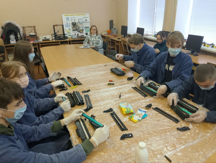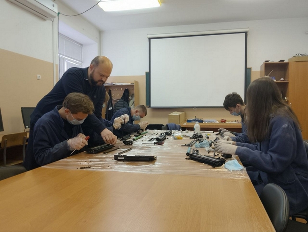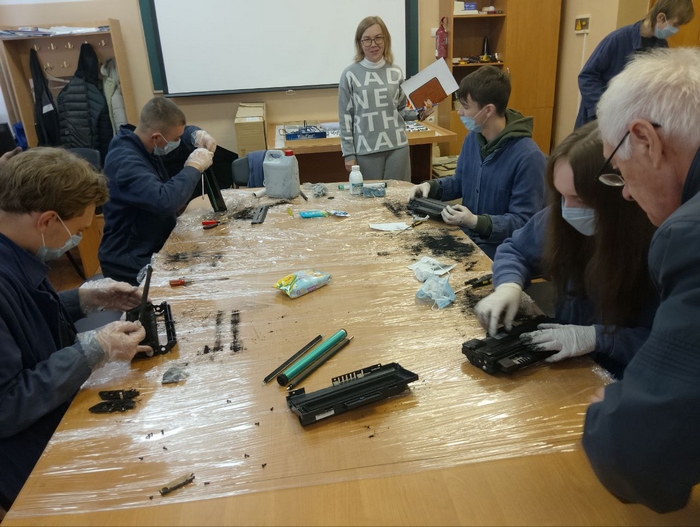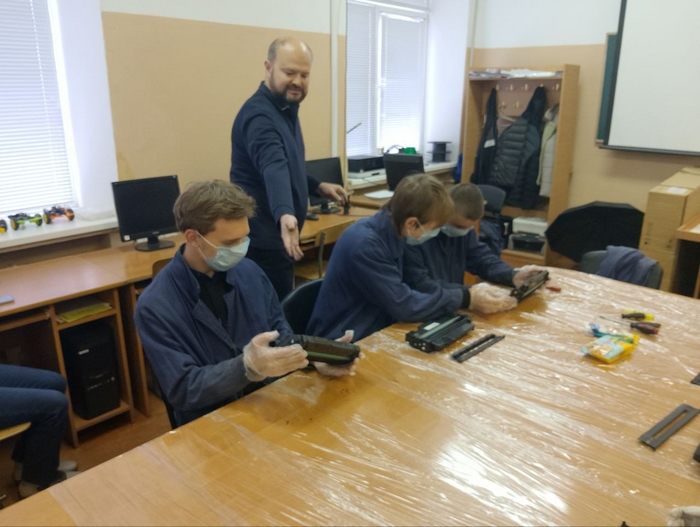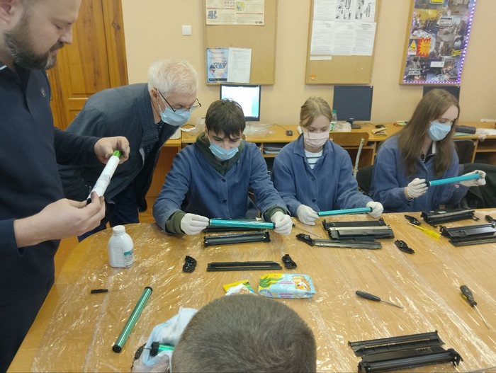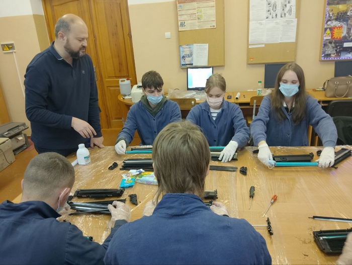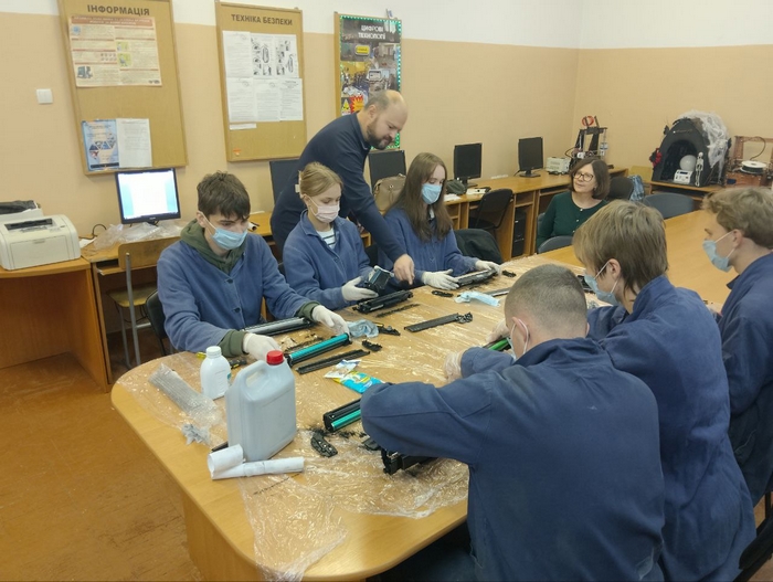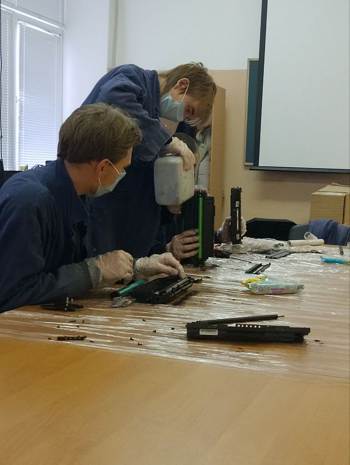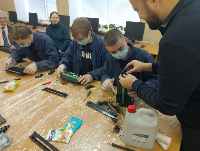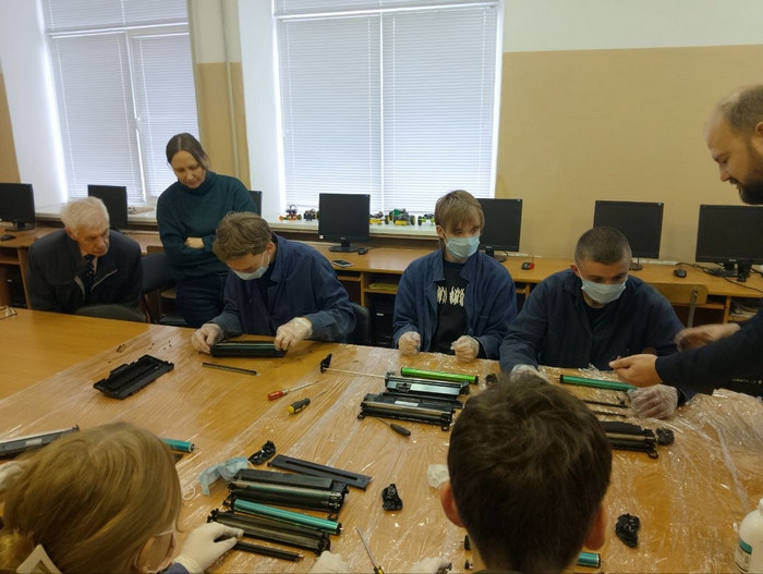 Після демонстрації кожен студент отримав власний картридж і мав змогу виконати повний цикл заправки: розбирання, очищення, заповнення тонером, збирання та тестування. У процесі роботи викладач детально пояснював функції кожного елемента картриджа, звертав увагу на типові несправності, що впливають на якість друку, та методи їх усунення. Студенти вчилися не просто виконувати дії, а розуміти фізику й логіку процесу.