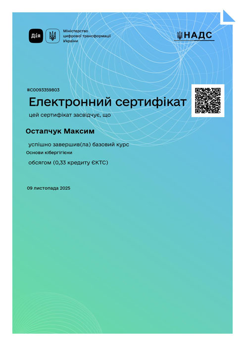 У межах робочої програми вибіркової дисципліни «Основи захисту інформації» (проф. Трифонова О.М.) успішно пройшли базовий курс «Основи кібергігієни» (М. Рехман, В. Воропай), курси «Інформаційна безпека» (І. Третяк, Б. Дунай, Д. Іващенко, Ю. Колесник) та «Цифрова безпека на персональному рівні» (Ю. Колесник), а також успішно пройшли тестування «Цифрограм для службовців» на національній онлайн платформі Дія. Освіта (М. Рехман, В. Воропай) і отримали відповідні сертифікати.
