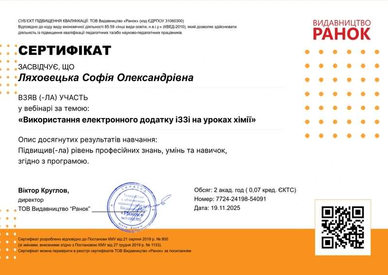 На кафедрі природничих наук і методик викладання значна увага приділяється залученню професіоналів-практиків до проведення занять. Так, 19 ЛИСТОПАДА 2025 р. д.п.н., професор Валентина Плющ та здобувачі освіти спеціальності 014 Середня освіта «Біологія та здоров’я людини, Хімія» другого (магістерського) рівнів вищої освіти взяли участь у вебінарі «Використання електронного додатку ІЗЗІ на уроках хімії», під час якого спікерка Лідія Мартинець, методистка з хімії та біології видавництва "Ранок", вчителька біології та хімії надала практичні рекомендації щодо використання електронного додатку ІЗЗІ під час уроків хімії.