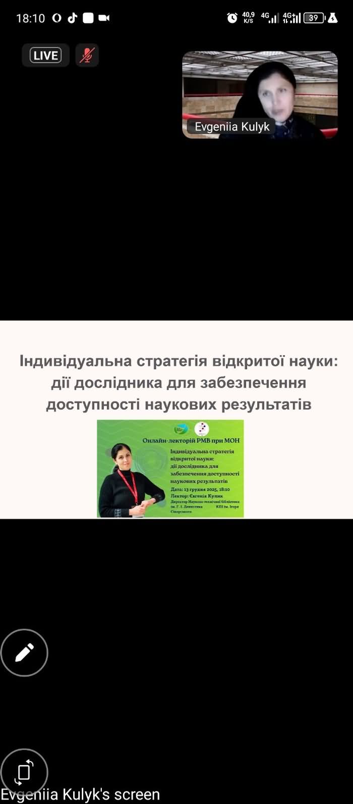 13 грудня 2025 року здобувачі освіти другого (магістерського) рівня вищої освіти освітньої програми Середня освіта (Біологія та здоровʼя людини, Хімія) взяли участь в онлайн-лекторії Ради молодих вчених при Міністерстві освіти і науки України №45 на тему «Індивідуальна стратегія відкритої науки: дії дослідника для забезпечення доступності наукових результатів»; лектор: Євгенія Кулик, директор Науково-технічної бібліотеки ім. Г. І. Денисенка, НТУУ «Київський політехнічний інститут імені Ігоря Сікорського»