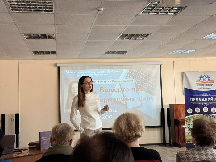 11 березня 2026 року студенти освітніх програм «Професійна освіта (Цифрові технології)» та «Інформаційні системи та технології. Штучний інтелект» разом із викладачами кафедри інформаційних та цифрових технологій – докторкою педагогічних наук, професоркою О.М.Трифоновою та докторкою філософії М.В.Луньовою – взяли участь у творчій зустрічі «Відверто про інформаційну війну», що проходив у Обласній універсальній науковій бібліотеці ім. Д.І.Чижевського.
