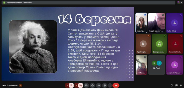Напередодні 14 березня на факультеті інформаційних технологій, математики та природничих наук панувала особлива атмосфера — ми святкували Міжнародний день числа Пі. Цей захід став результатом чудової співпраці представників студентської ради та кафедри математики, фізики та методик викладання. Роль ведучих на себе взяли представниці студентської ради та студентки кафедри: Марія Гребенюк (спеціальність «Середня освіта (Математика та інформатика)») та Катерина Давидовська (спеціальність «Середня освіта (Математика та фізика)»), яким вдалося зацікавити кожного присутнього.