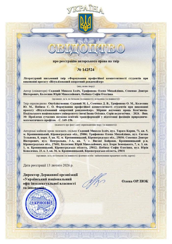 13 березня 2026 року отримано авторське свідоцтво на наукову статтю «Формування професійної компетентності студентів при виконанні проєкту “Візуалізований апаратний рандомайзер”».