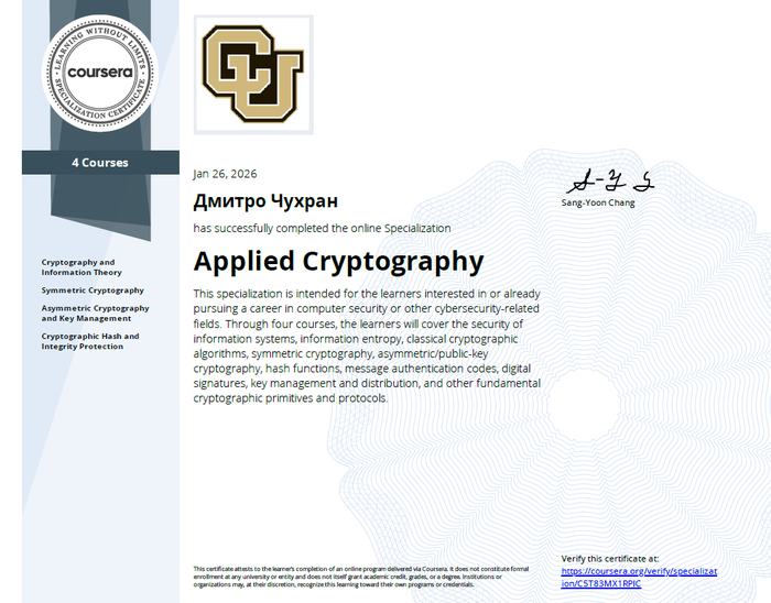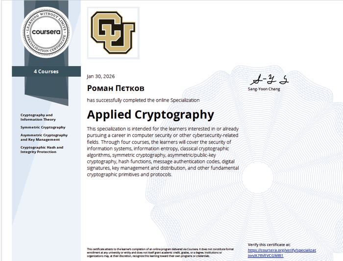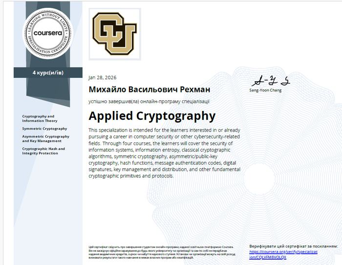 З метою розширення освітніх можливостей та формування професійних компетентностей студенти групи КН25М пройшли навчання за курсом «Прикладна криптографія» на базі освітньої платформи Coursera у форматі неформальної освіти та отримали сертифікати.