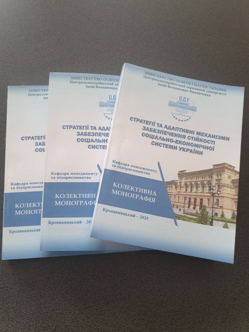 У Центральноукраїнському державному університеті імені Володимира Винниченка видано колективну монографію «Стратегії та адаптивні механізми забезпечення стійкості соціально-економічної системи України», рекомендовану до друку рішенням Вченої ради університету (протокол № 5 від 01.12.2025 р.).