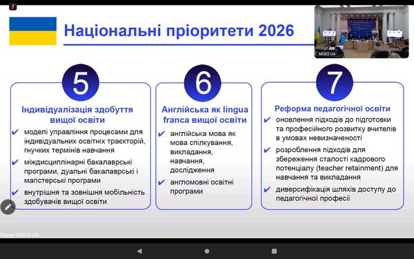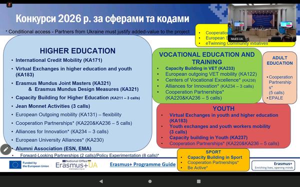 - Пріоритети Програми ЄС «Еразмус+» на 2026 рік — учасники отримали детальний огляд ключових напрямів підтримки у сферах вищої освіти, молоді, спорту та професійної освіти, зокрема з акцентом на цифрову інклюзію, сталий розвиток, підвищення якості освіти та інклюзивність.